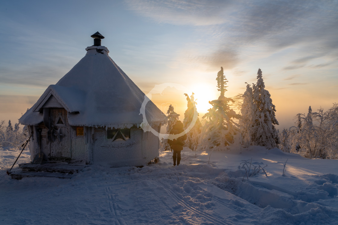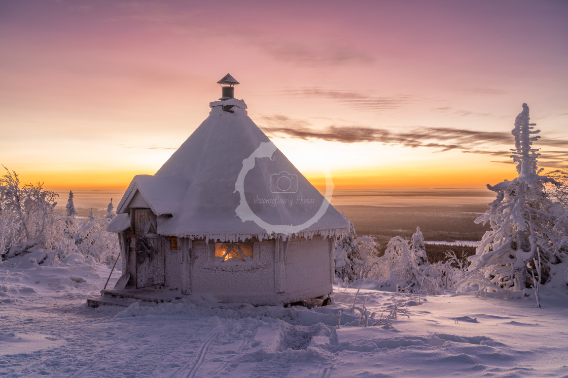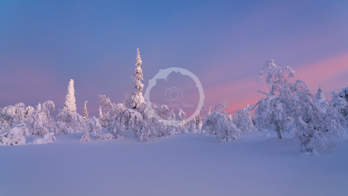 Snow and colourful sunrise in Kuntivaara - Lapland, Finland